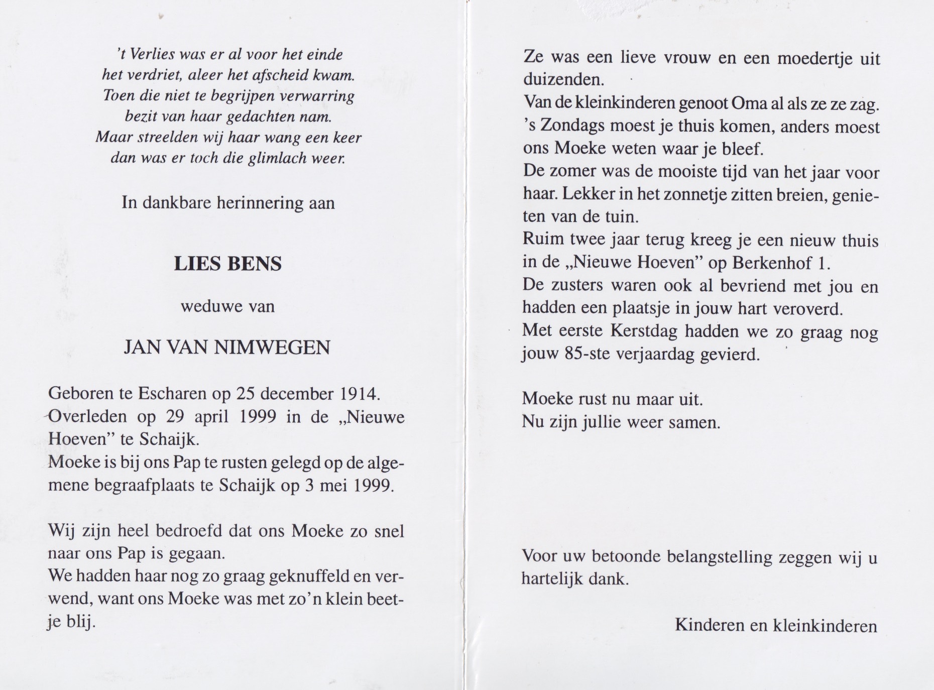 25-12-1914 29-4-1999 Bens, Lies Doopnamen: Lies Roepnaam: Lies Achternaam: Bens Geboren: 25-12-1914, Escharen Overleden: 29-4-1999, Schaijk Leeftijd: 84 Begrafenis/crematie te: Schaijk Partner van: Jan van Nimwegen Archiefnummer: 6.15.4