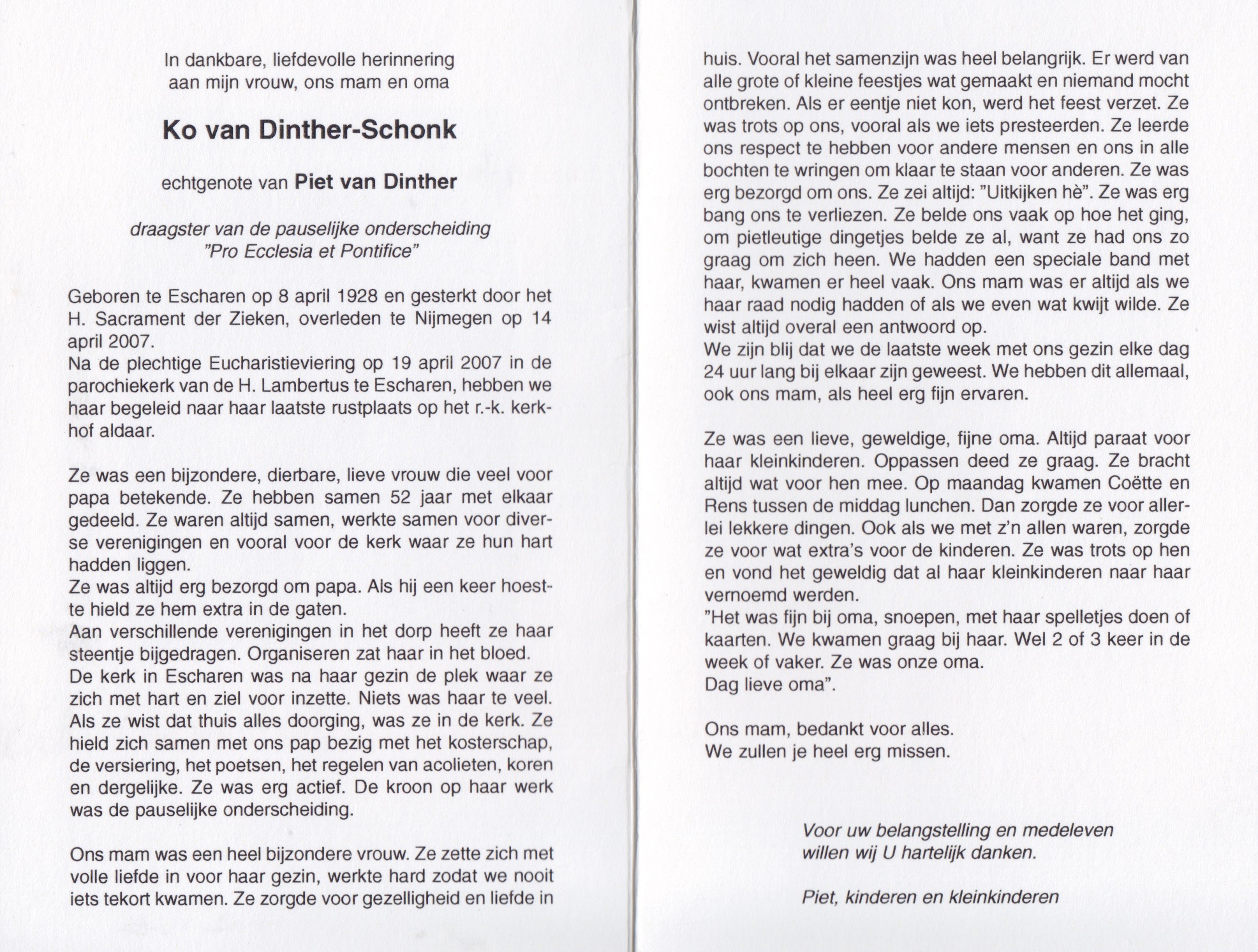 8-4-1928 14-4-2007 Schonk, Ko Doopnamen: Ko Roepnaam: Ko Achternaam: Schonk Geboren: 8-4-1928, Escharen Overleden: 14-4-2007, Nijmegen Leeftijd: 79 Begrafenis/crematie te: Escharen Partner van: Piet van Dinther Archiefnummer: 6.20.3 Terug