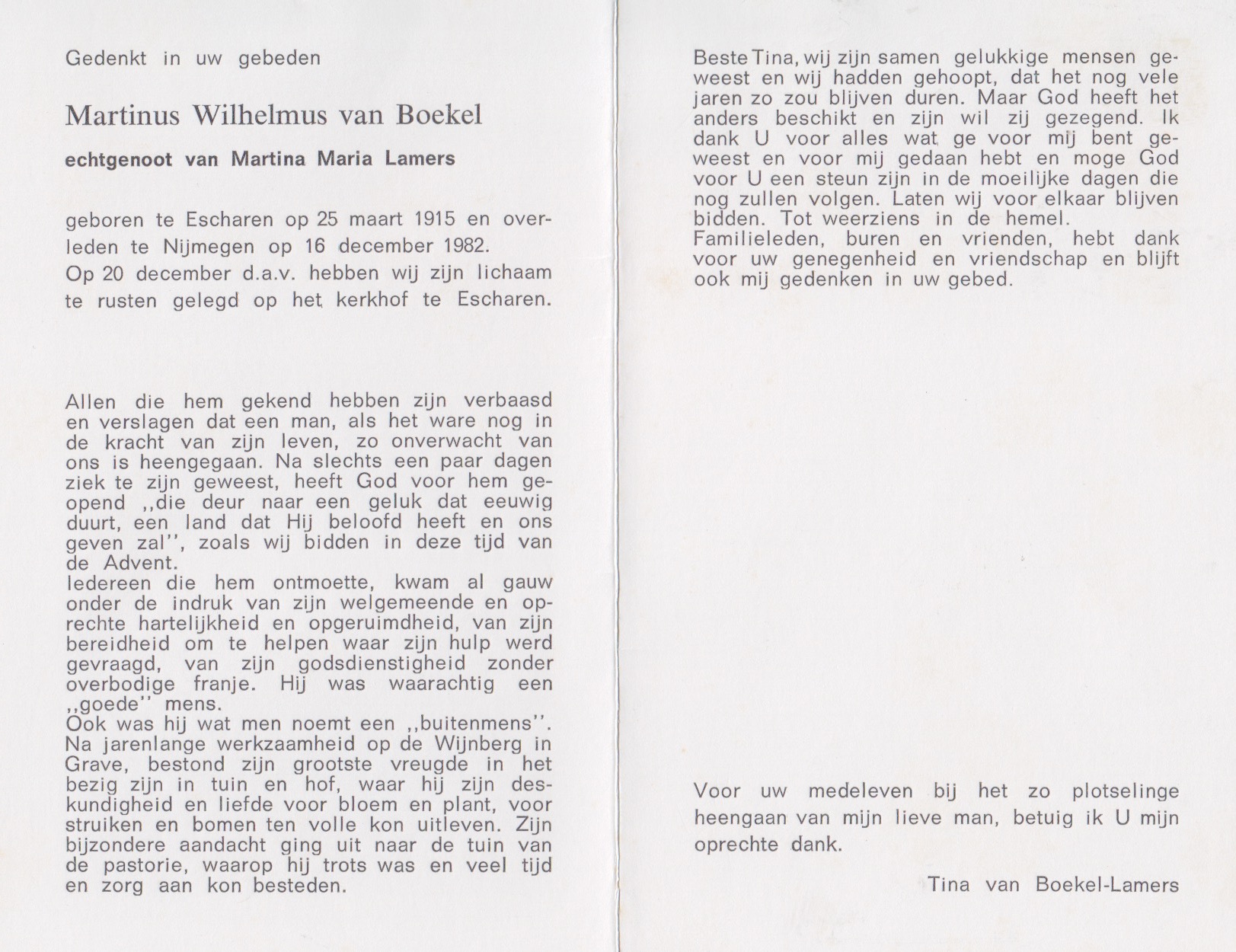 25-3-1915 16-12-1982 Boekel, Martinus Wilhelmus van Doopnamen: Martinus Wilhelmus Roepnaam: Martien Achternaam: van Boekel Geboren: 25-3-1915, Escharen Overleden: 16-12-1982, Nijmegen Leeftijd: 67 Begrafenis/crematie te: Escharen Partner van: Tina Lamers Archiefnummer: 6.6.3