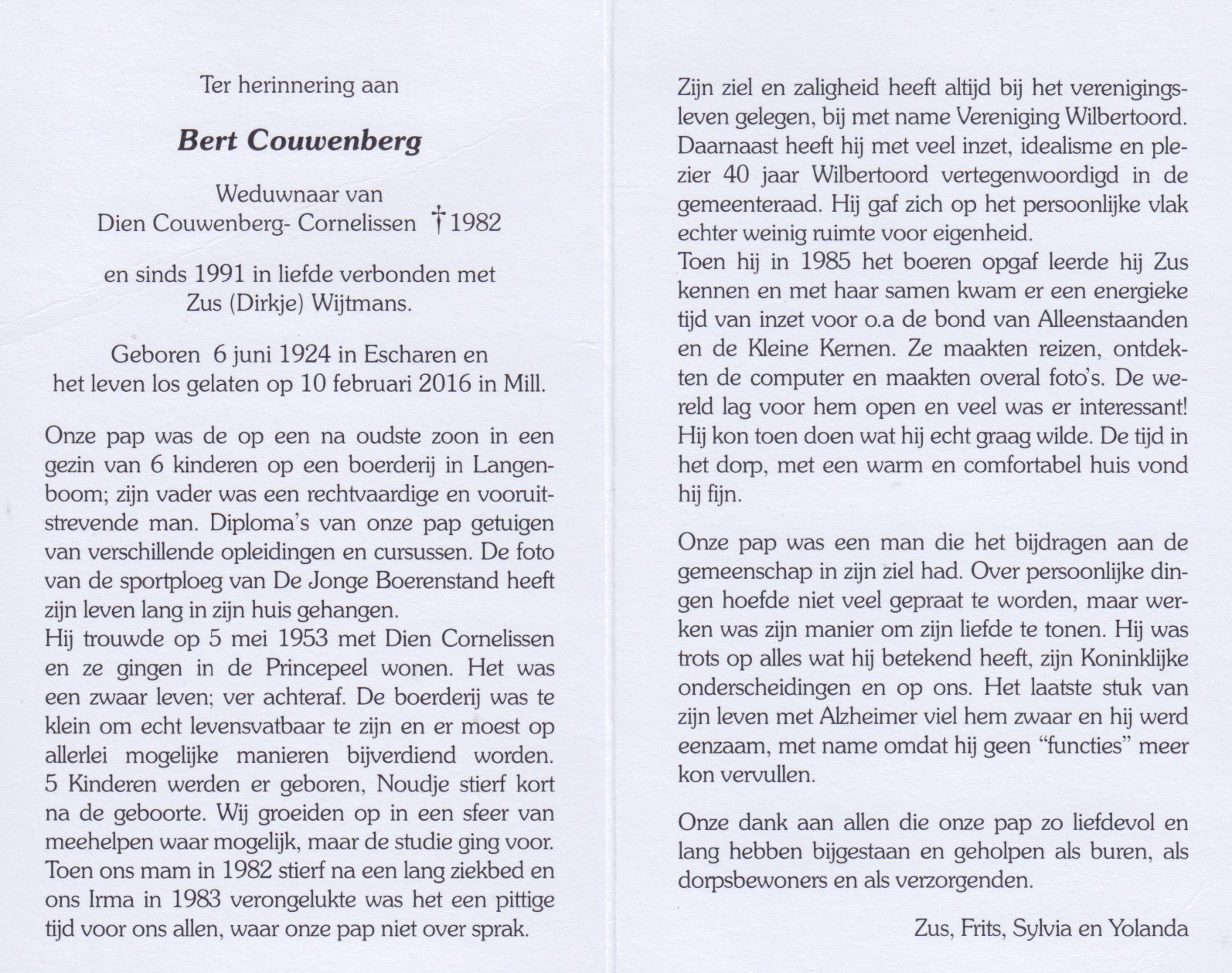 6-6-1924 10-2-2016 Couwenberg, Bert Doopnamen: Albertus Hendrikus Roepnaam: Bert Achternaam: Couwenberg Geboren: 6-6-1924, Escharen Overleden: 10-2-2016, Mill Leeftijd: 91 Begrafenis/crematie te: Wilbertoord Partner van: Zus Dirkje Wijtmans Eerder gehuwd met: Dien Cornelissen Archiefnummer: 7-12-1