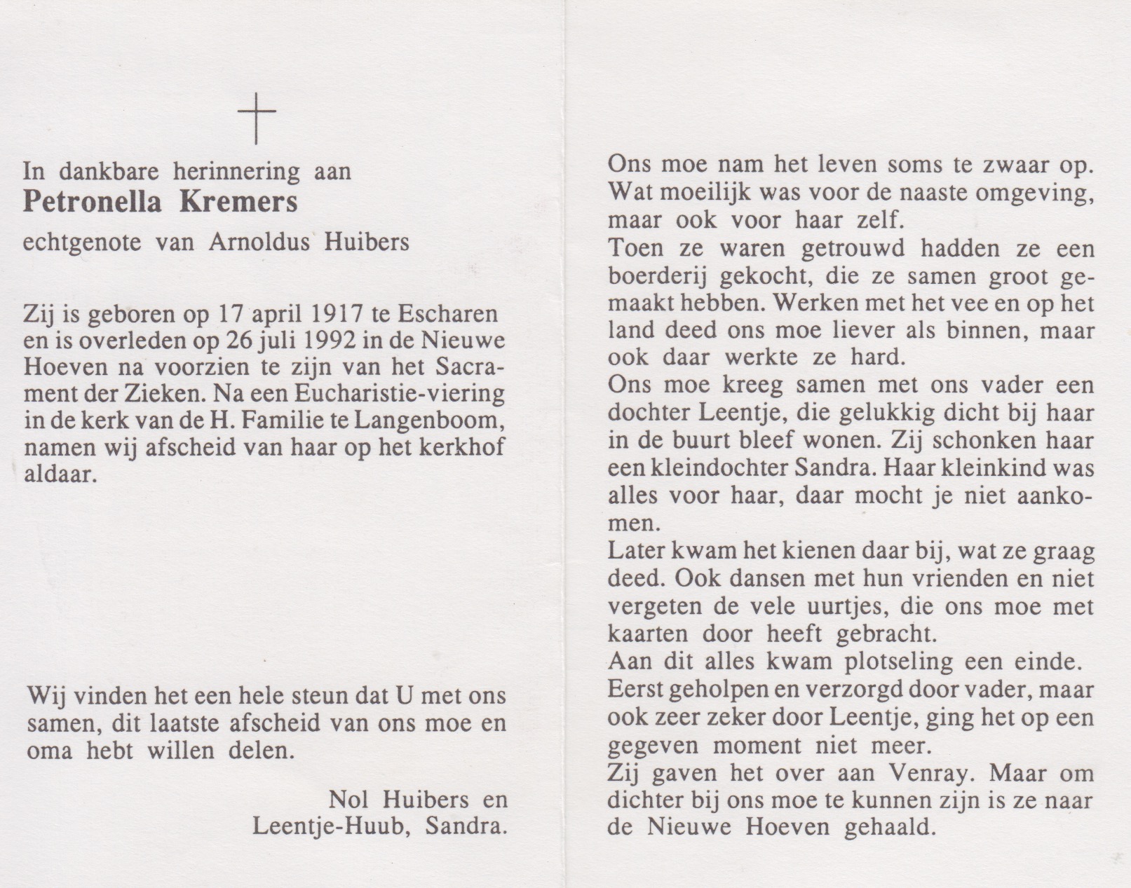 17-4-1917 26-7-1992 Kremers, Petronella Doopnamen: Petronella Achternaam: Kremers Geboren: 17-4-1917, Escharen Overleden: 26-7-1992, Schaijk Leeftijd: 75 Begrafenis/crematie te: Langenboom Partner van: Arnoldus Huibers Archiefnummer: 7-21-5