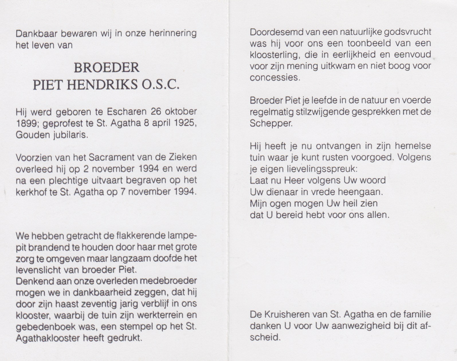 26-10-1899 2-11-1994 Hendriks, Broeder Piet O.S.C. Doopnamen: Broeder Piet O.S.C. Roepnaam: Piet Achternaam: Hendriks Geboren: 26-10-1899, Escharen Overleden: 2-11-1994, St Agatha Leeftijd: 95 Begrafenis/crematie te: St Agatha Archiefnummer: 7-24-6
