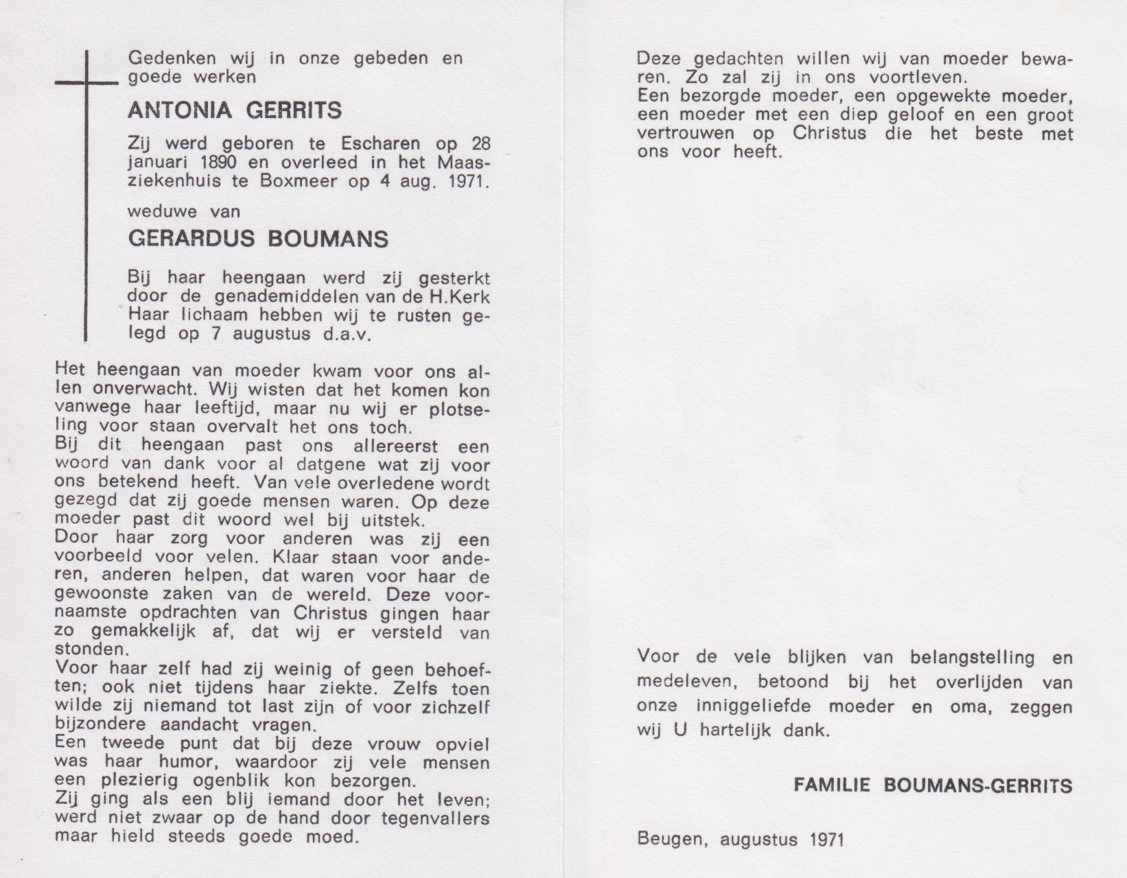 28-1-1890 4-8-1971 Gerrits, Antonia Doopnamen: Antonia Achternaam: Gerrits Geboren: 28-1-1890, Escharen Overleden: 4-8-1971, Boxmeer Leeftijd: 81 Begrafenis/crematie te: Beugen Partner van: Gerardus Boumans Archiefnummer: 7-5-3