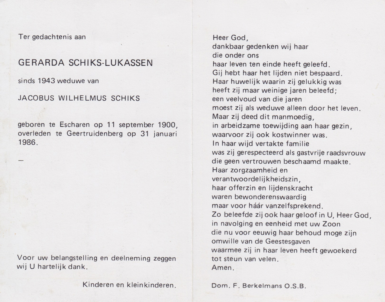 11-11-1900 31-1-1986 Lukassen, Gerarda Doopnamen: Gerarda Achternaam: Lukassen Geboren: 11-11-1900, Escharen Overleden: 31-1-1986, Geertruidenberg Leeftijd: 85 Partner van: Jacobus Wilhelmus Schiks Archiefnummer: 7-8-1 Terug