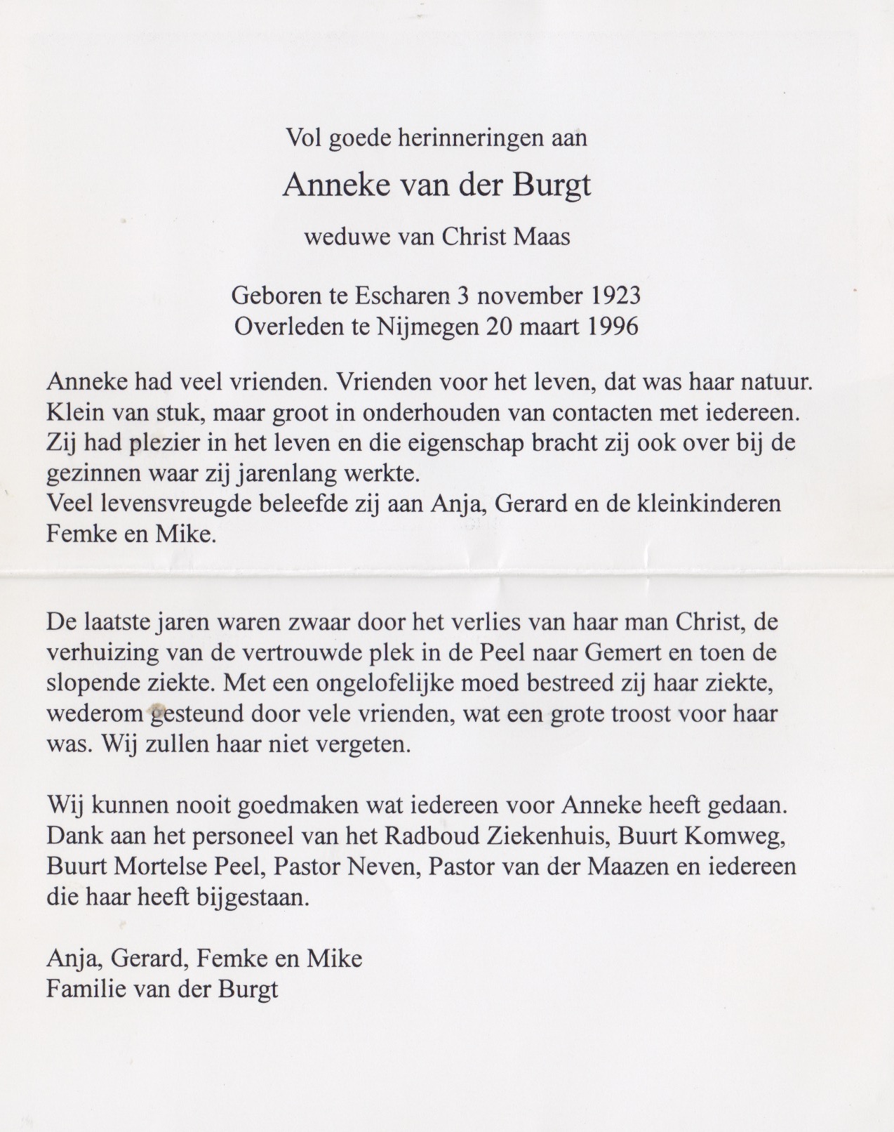 3-11-1923 20-3-1996 Burgt, Anneke van der Doopnamen: Anneke Roepnaam: Anneke Achternaam: van der Burgt Geboren: 3-11-1923, Escharen Overleden: 20-3-1996, Nijmegen Leeftijd: 72 Partner van: Christ Maas Archiefnummer: 7-9-2