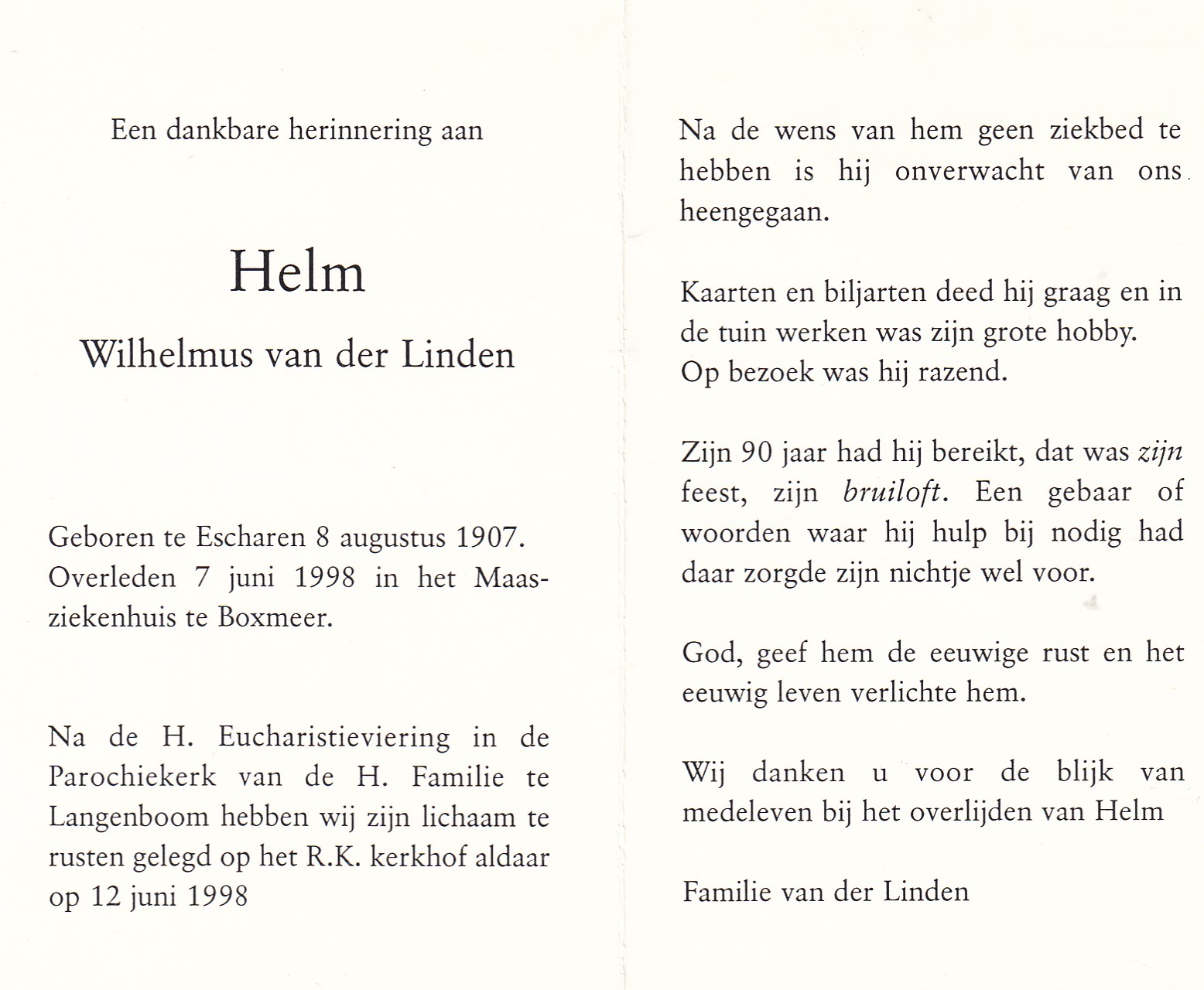 8-8-1907 7-6-1998 Linden, Wilhelmus van der Doopnamen: Wilhelmus Roepnaam: Helm Achternaam: van der Linden Geboren: 8-8-1907, Escharen Overleden: 7-6-1998, Boxmeer Leeftijd: 90 Begrafenis/crematie te: Langenboom Archiefnummer: 8-13-1