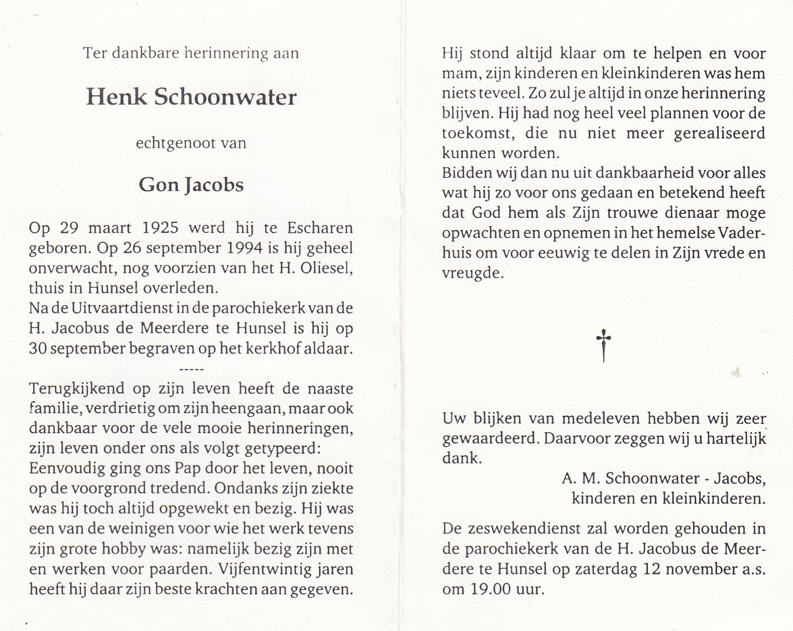29-3-1925 26-9-1994 Schoonwater, Henk Doopnamen: Henk Roepnaam: Henk Achternaam: Schoonwater Geboren: 29-3-1925, Escharen Overleden: 26-9-1994, Hunsel Leeftijd: 69 Begrafenis/crematie te: Hunsel Partner van: Gon Jacobs Archiefnummer: 8-15-4