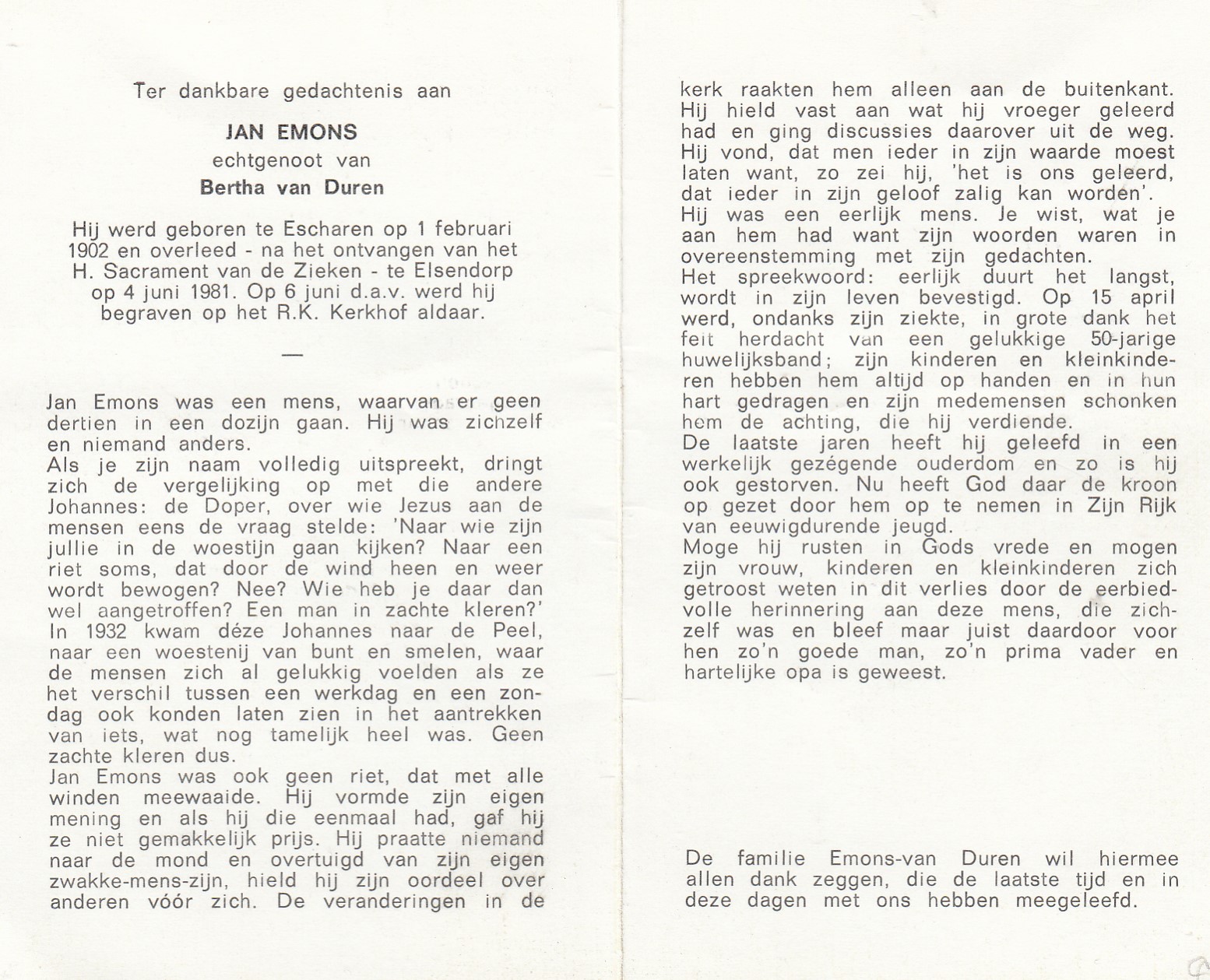 1-2-1902 4-6-1981 Emons, Jan Doopnamen: Jan Roepnaam: Jan Achternaam: Emons Geboren: 1-2-1902, Escharen Overleden: 4-6-1981, Elsendorp Leeftijd: 79 Begrafenis/crematie te: Elsendorp Partner van: Bertha van Duren Archiefnummer: 8-17-4