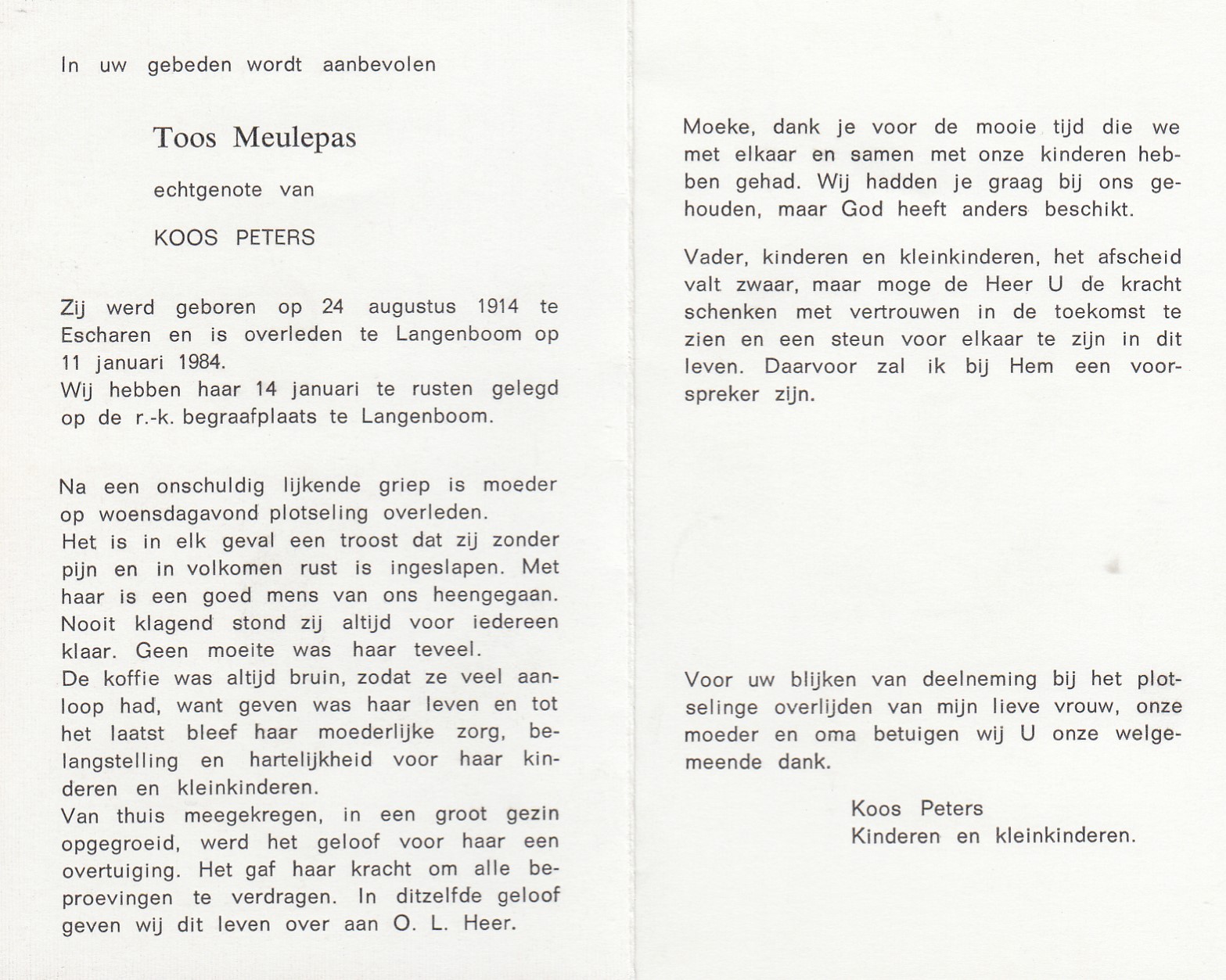24-8-1914 11-1-1984 Meulepas, Toos Doopnamen: Toos Roepnaam: Toos Achternaam: Meulepas Geboren: 24-8-1914, Escharen Overleden: 11-1-1984, Langenboom Leeftijd: 69 Begrafenis/crematie te: Langenboom Partner van: Koos Peters Archiefnummer: 8-21-5