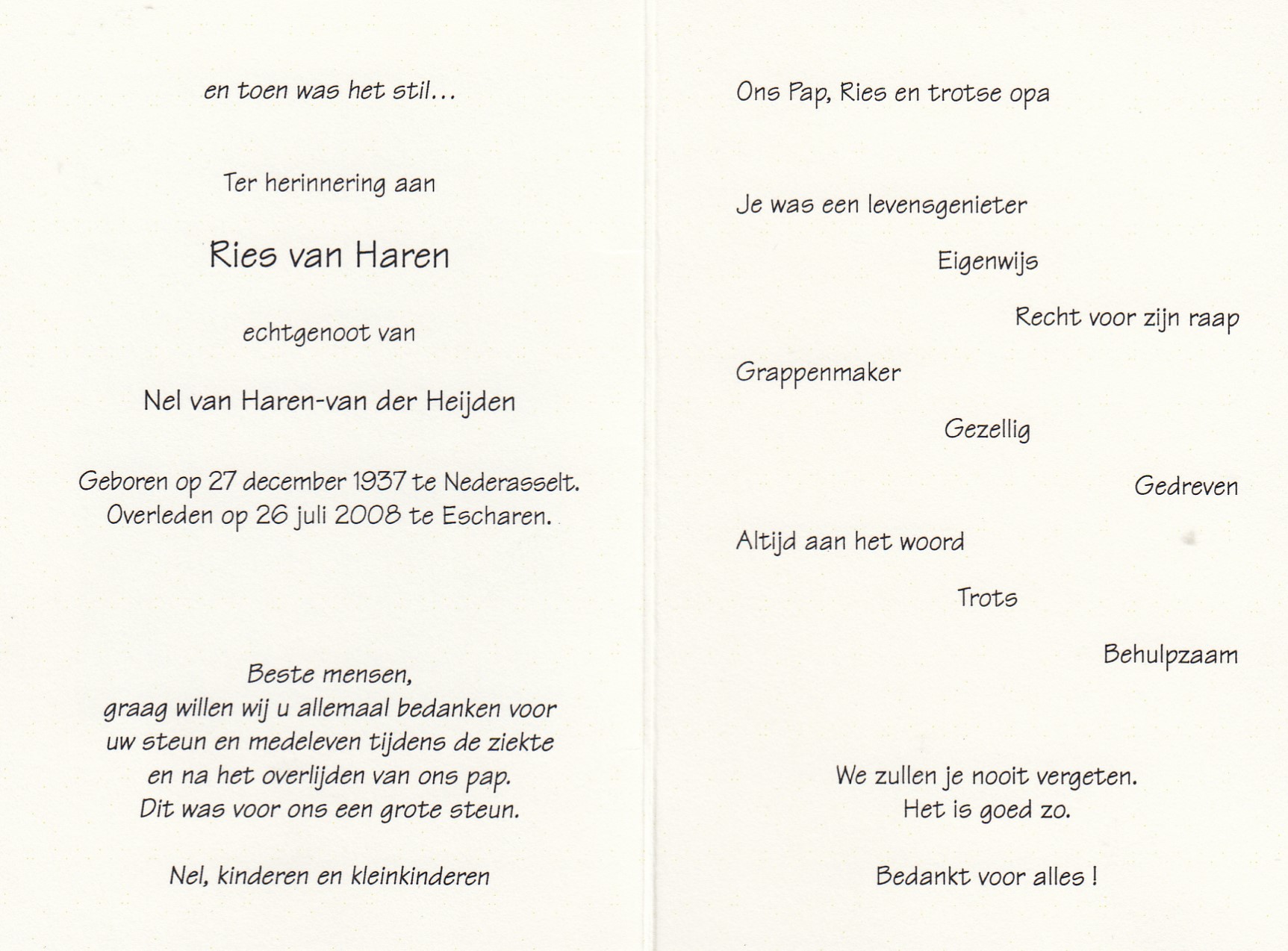 27-12-1937 26-7-2008 Haren, Ries van Doopnamen: Ries Roepnaam: Ries Achternaam: van Haren Geboren: 27-12-1937, Nederasselt Overleden: 26-7-2008, Escharen Leeftijd: 70 Begrafenis/crematie te: Escharen Partner van: Nel van der Heijden Archiefnummer: 8-23-5