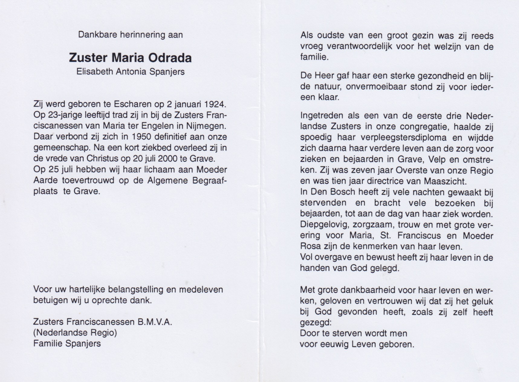 2-1-1924 20-7-2000 Spanjers, Elisabeth Antonia Doopnamen: Elisabeth Antonia Roepnaam: Zuster Maria Odrada Achternaam: Spanjers Geboren: 2-1-1924, Escharen Overleden: 20-7-2000, Grave Leeftijd: 76 Begrafenis/crematie te: Grave Archiefnummer: 8-25-3 Terug