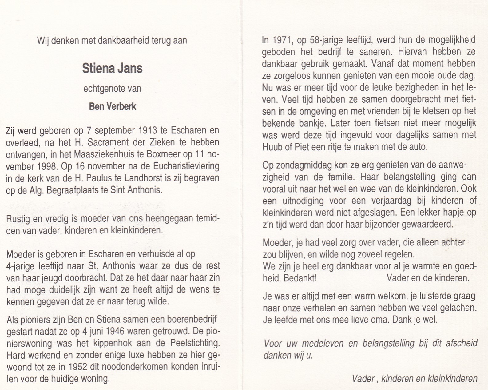7-9-1913 11-11-1998 Jans, Stiena Doopnamen: Stiena Roepnaam: Stiena Achternaam: Jans Geboren: 7-9-1913, Escharen Overleden: 11-11-1998, Boxmeer Leeftijd: 85 Begrafenis/crematie te: St.Anthonis Partner van: Ben Verberk Archiefnummer: 8-4-1