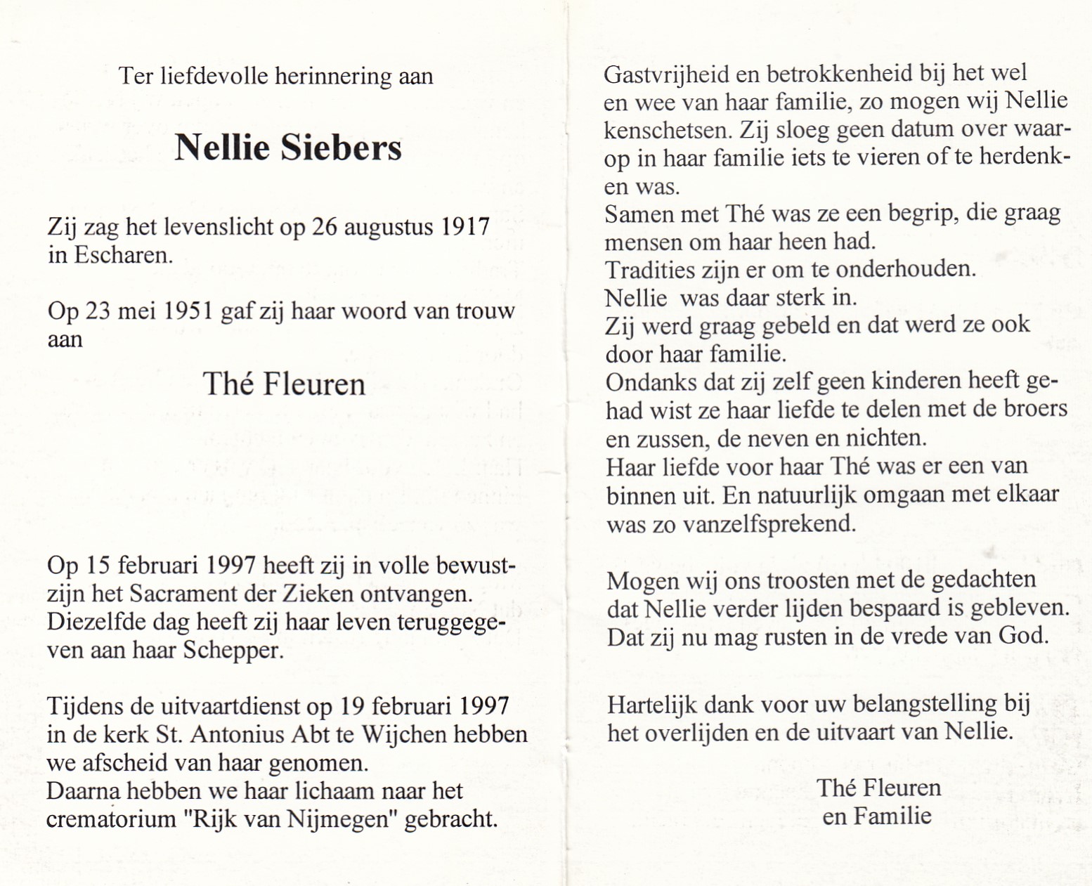 26-8-1917 15-2-1997 Siebers, Nellie Doopnamen: Nellie Roepnaam: Nellie Achternaam: Siebers Geboren: 26-8-1917, Escharen Overleden: 15-2-1997, Wijchen Leeftijd: 79 Begrafenis/crematie te: Nijmegen Partner van: Thé Fleuren Archiefnummer: 8-8-1