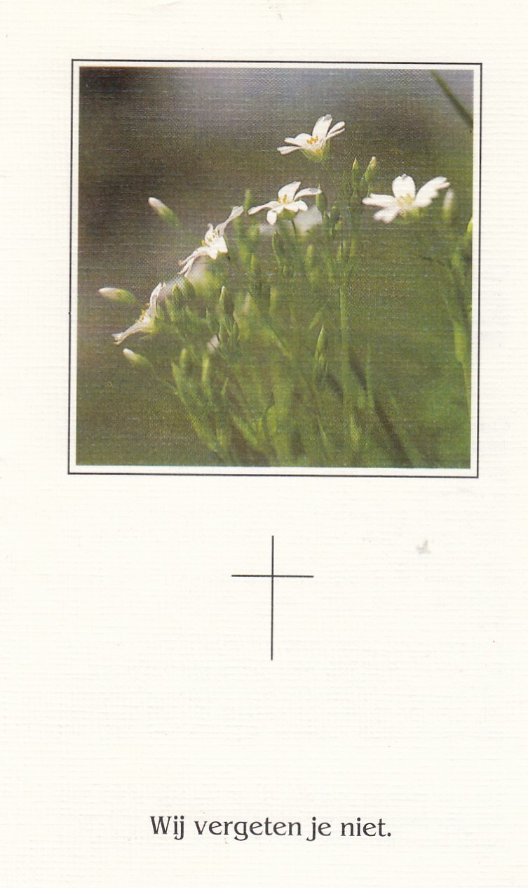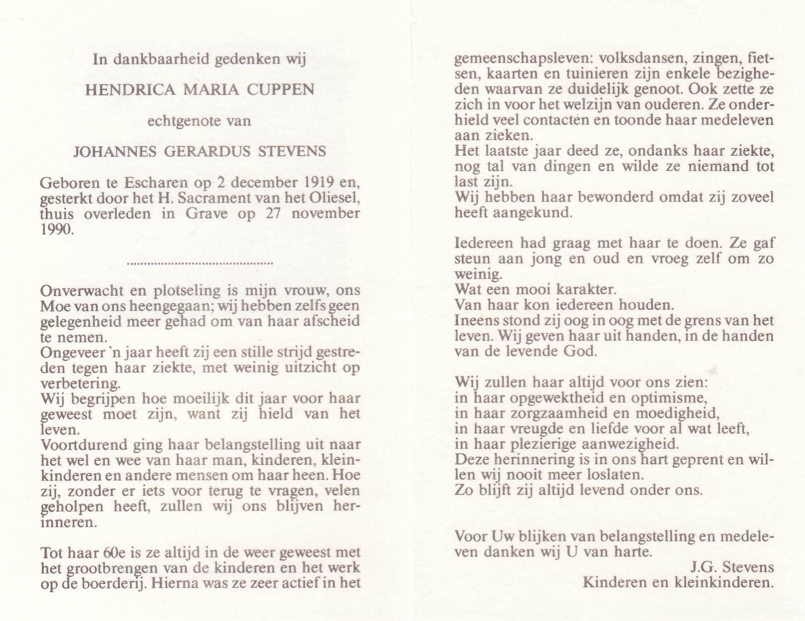 2-12-1919 27-11-1990 Cuppen, Hendrica Maria Doopnamen: Hendrica Maria Roepnaam: Riek Achternaam: Cuppen Geboren: 2-12-1919, Escharen Overleden: 27-11-1990, Grave Leeftijd: 70 Begrafenis/crematie te: Escharen Partner van: Johannes Gerardus Stevens Archiefnummer: 8-9-6 Terug