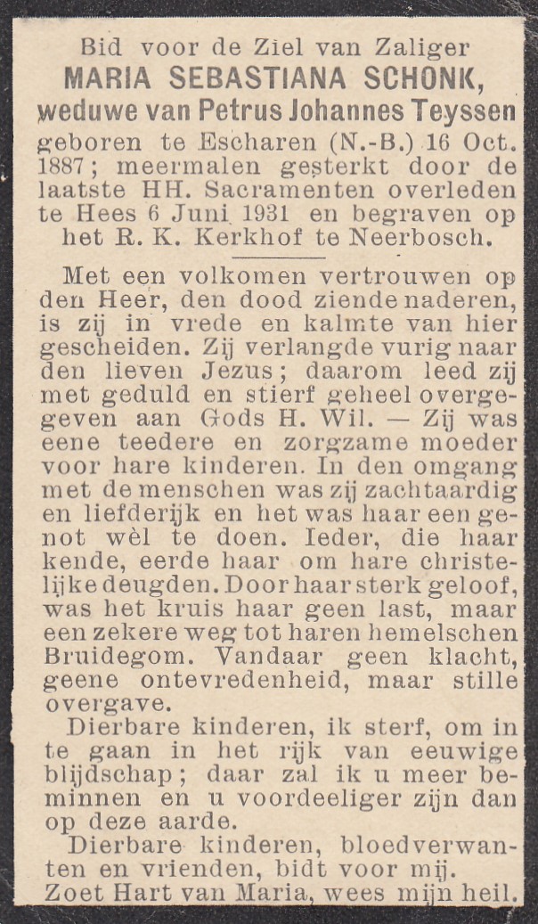 16-10-1887 6-6-1931 Schonk, Maria Sebastiana Doopnamen: Maria Sebastiana Achternaam: Schonk Geboren: 16-10-1887, Escharen Overleden: 6-6-1931, Hees Leeftijd: 43 Begrafenis/crematie te: Neerbosch Partner van: Petrus Johannes Teijssen Archiefnummer: 9-13-2