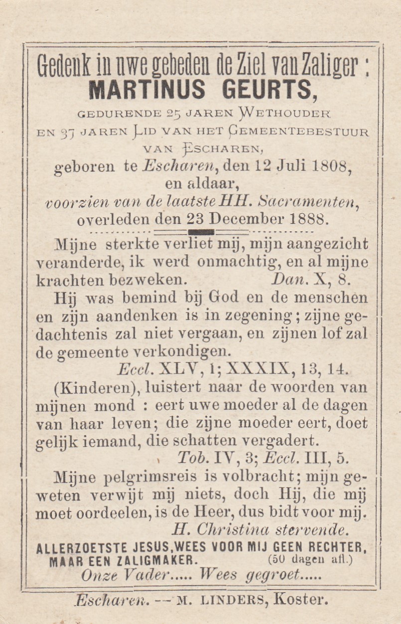12-7-1808 23-12-1888 Geurts, Martinus Doopnamen: Martinus Achternaam: Geurts Geboren: 12-7-1808, Escharen Overleden: 23-12-1888, Escharen Leeftijd: 80 Begrafenis/crematie te: Escharen Archiefnummer: 9-13-6