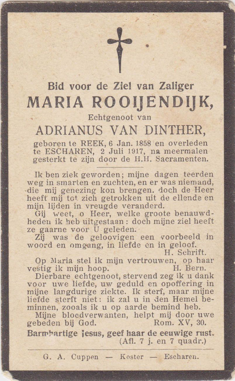 6-1-1858 2-7-1917 Rooijendijk, Maria Doopnamen: Maria Roepnaam: Maria Achternaam: Rooijendijk Geboren: 6-1-1858, Reek Overleden: 2-7-1917, Escharen Leeftijd: 59 Begrafenis/crematie te: Escharen Partner van: Adrianus van Dinther Archiefnummer: 9-17-1