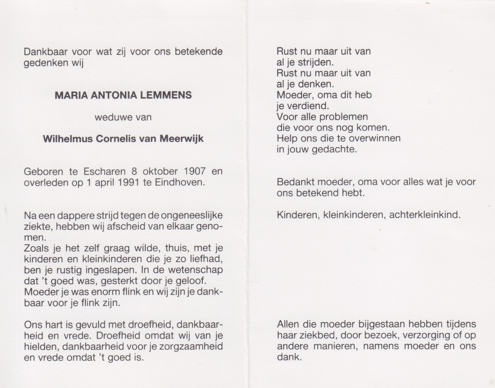 8-10-1907 1-4-1991 Lemmens, Maria Antonia Doopnamen: Maria Antonia Achternaam: Lemmens Geboren: 8-10-1907, Escharen Overleden: 1-4-1991, Eindhoven Leeftijd: 83 Partner van: Wilhelmus C. Van Meerwijk Archiefnummer: 9-18-1