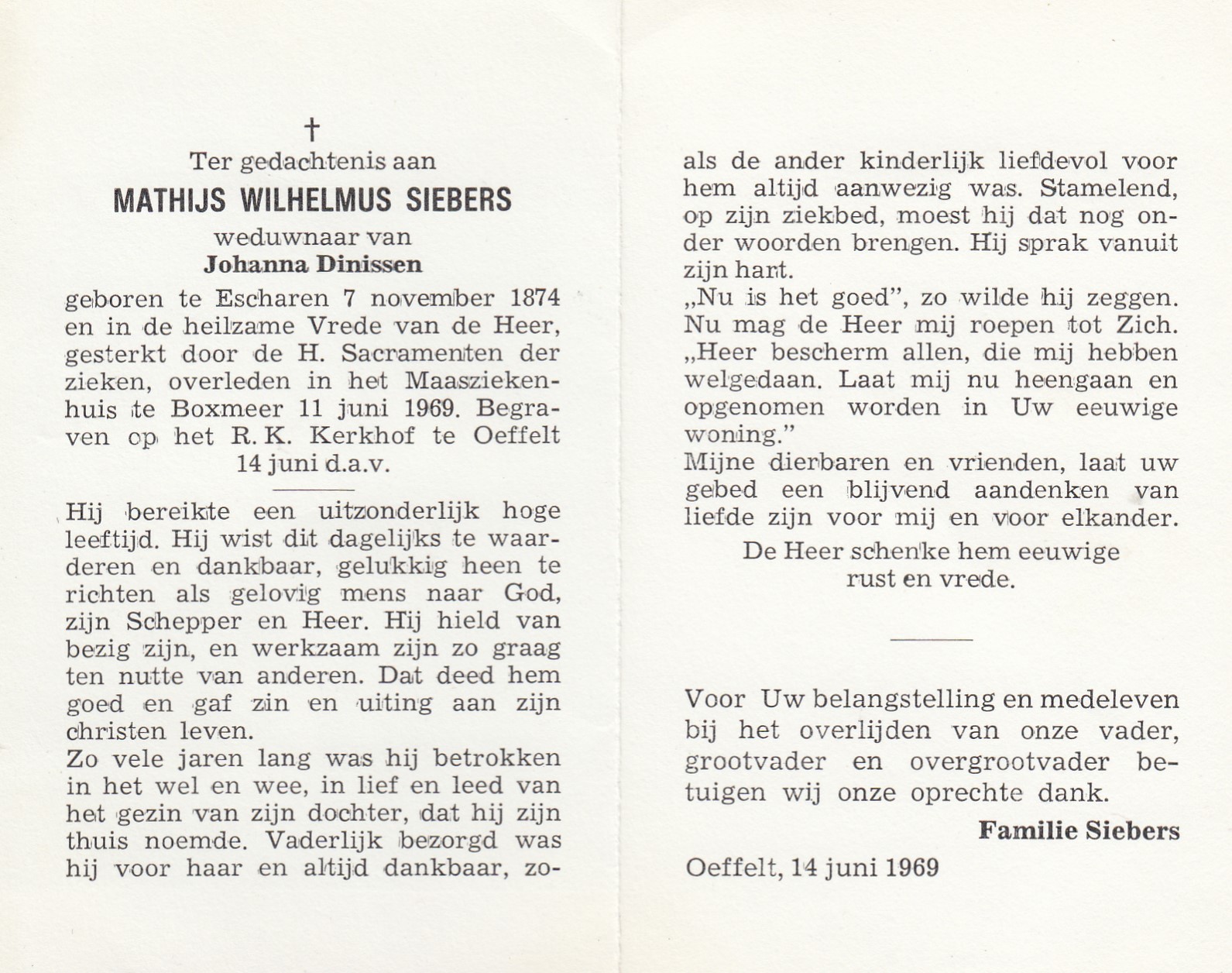 7-11-1874 11-6-1969 Siebers, Mathijs Wilhelmus Doopnamen: Mathijs Wilhelmus Achternaam: Siebers Geboren: 7-11-1874, Escharen Overleden: 11-6-1969, Boxmeer Leeftijd: 94 Begrafenis/crematie te: Oeffelt Partner van: Johanna Dinissen Archiefnummer: 9-2-2