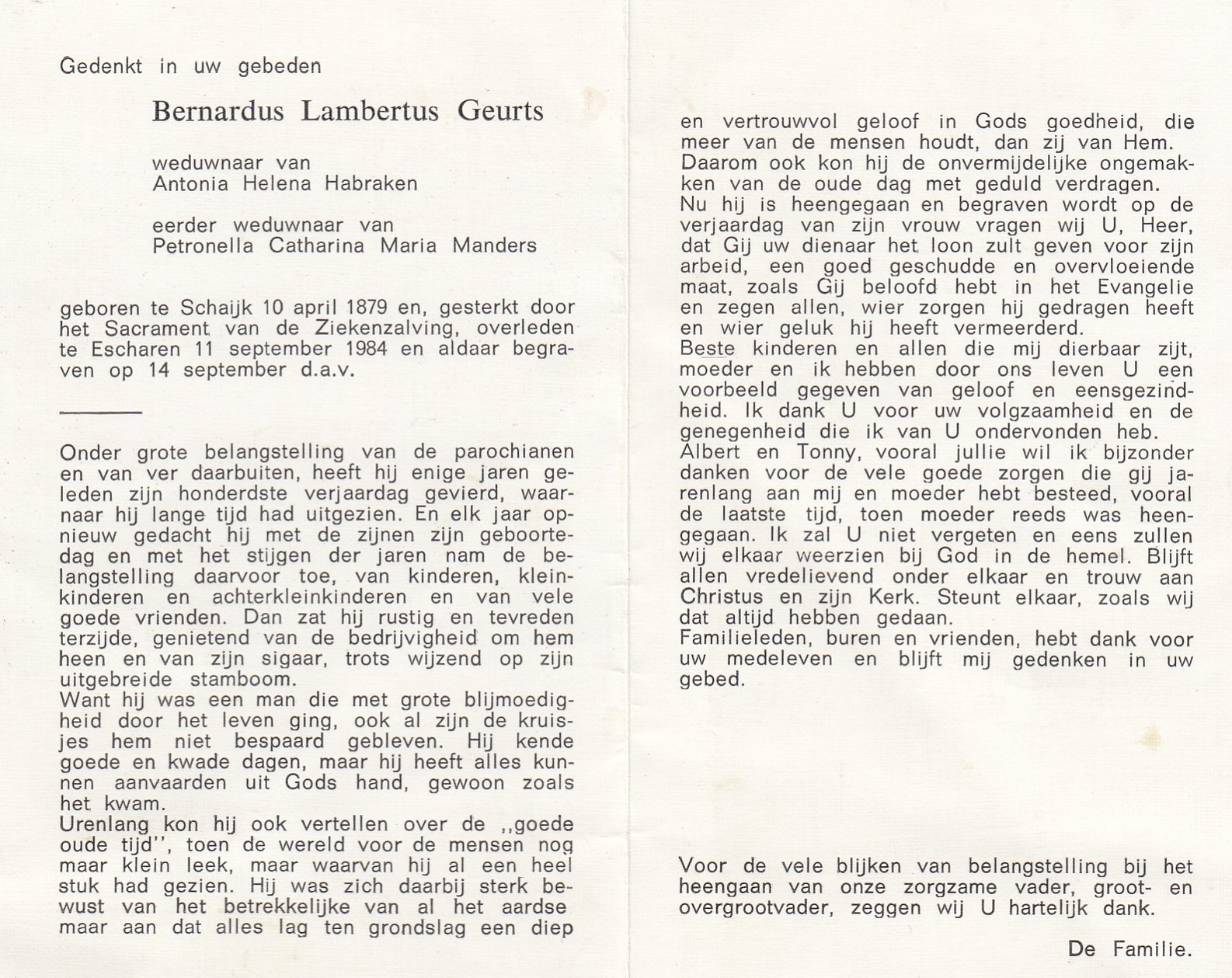 10-4-1879 11-9-1984 Geurts, Bernardus Lambertus Doopnamen: Bernardus Lambertus Roepnaam: Nadje Achternaam: Geurts Geboren: 10-4-1879, Escharen Overleden: 11-9-1984, Escharen Leeftijd: 105 Partner van: Antonis Helena Habraken Eerder gehuwd met: Petronella C. M. Manders Archiefnummer: 9-20-1