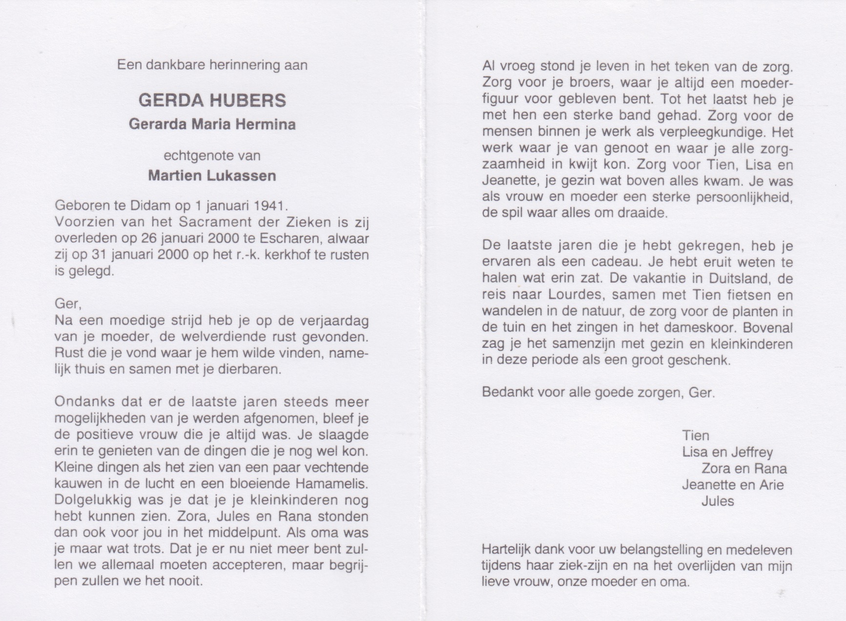 1-1-1941 26-1-2000 Hubers, Gerarda Maria Hermina Doopnamen: Gerarda Maria Hermina Roepnaam: Gerda Achternaam: Hubers Geboren: 1-1-1941, Didam Overleden: 26-1-2000, Escharen Leeftijd: 59 Begrafenis/crematie te: Escharen Partner van: Martien Lukassen Archiefnummer: 9-20-2