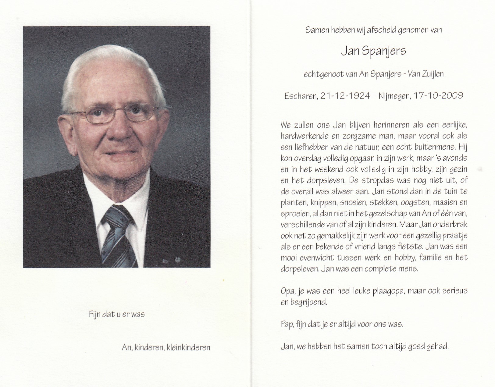 21-12-1924 17-10-2009 Spanjers, Jan Doopnamen: Jan Roepnaam: Jan Achternaam: Spanjers Geboren: 21-12-1924, Escharen Overleden: 17-10-2009, Nijmegen Leeftijd: 84 Partner van: An van Zuijlen Archiefnummer: 9-5-4 Terug